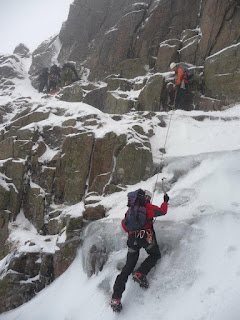 As Arno, Henry and myself headed up the Goat Track to Coire Domhain we noticed quite a few folk out climbing in VERY thin and less than ideal conditions. The Runnel, Central and Crotched gully were looking especially busy no doubt due to the almost complete lines of old snow in the Runnel (apart from the crux chimney!!!) There were folk climbing a number of other lines such as Fingers Ridge, Red Gully and Fiacaill Couloir. Nottingham MPS teams were on Fiacaill Ridge, The Seam and Hidden Chimney with Jonathan. Climbers were also on the Haston Line, Yukon Jack (retreating?) and Jacob's Ladder which can be seen in one of the photos above!!!! Several skiers spotted on the plateau carrying skis! A few more photos of the Winter Skills group on Fi's blog