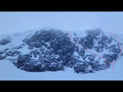 Aladdin's to the Goat Track - showing some of the routes climbed today which included several variations of the Mirror Direct and an unlisted ice fall and chimney (III) between Aladdin's upper Rib and Pygmy Ridge, Red Gully, several variations of Goat Track Gully and several short ice pitches even further right and the descents routes via Aladdin's Couloir and Central Gully Left.